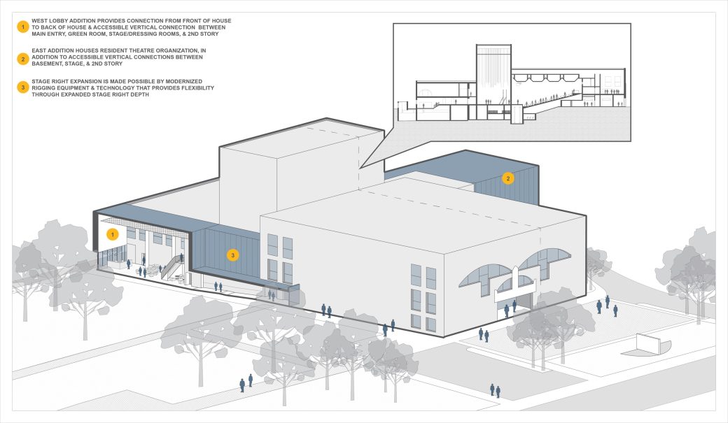 Improvements in accessibility, such as updated technology for the hearing impaired, handrails, wheelchair access to the stage, accessible seating, and elevators are incorporated. Orchestra access, modification of scenic stage traps and wing space, as well as concession areas and restrooms will improve the overall theater experience for staff, volunteers, and patrons alike.