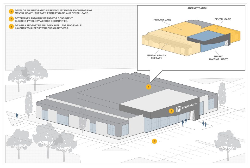 In the midst of a companywide rebrand and a care model shift, modifying all locations to become federally qualified health clinics, Bowen Health sought to rethink clinic spaces to incorporate primary care in addition to their traditional psychiatric therapy offerings. MKM worked with leadership and clinicians to create a prototype design for five new builds to fit the needs of all service areas, with flexibility to expand or eliminate portions, based on the footprint. Approximately 40 projects of varying complexity are anticipated for Bowen Health in northern Indiana and will span through 2027.