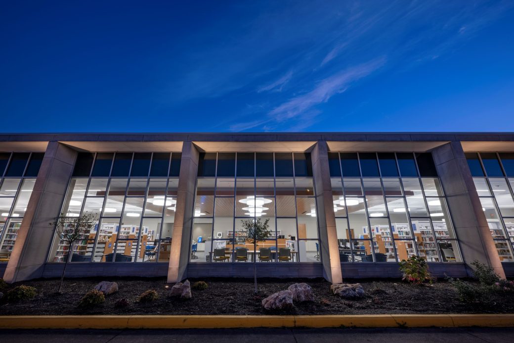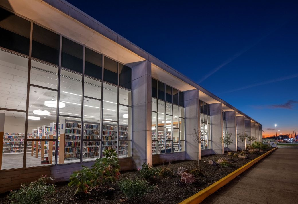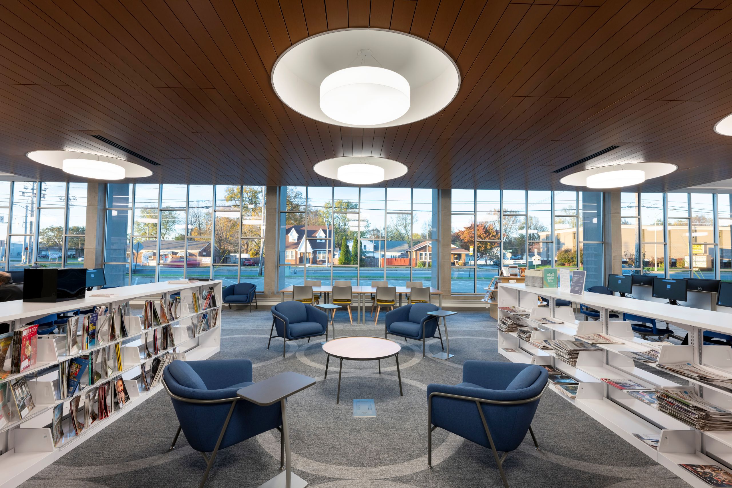 Established in 1965, EVPL McCollough is one of eight branches serving Vanderburgh County. Exterior upgrades were made to the east side of the building to direct foot traffic into the building from a larger parking area and nearer to the relocated children’s area. A neutral palette was used on the walls and fixtures with splashes of color in the décor. A wooden ceiling spans the length of the north side of the building and showcases a series of drum lights designed to reflect the building’s mid-century modern aesthetic. New bookshelves with custom end panel details and updated furniture were incorporated throughout.