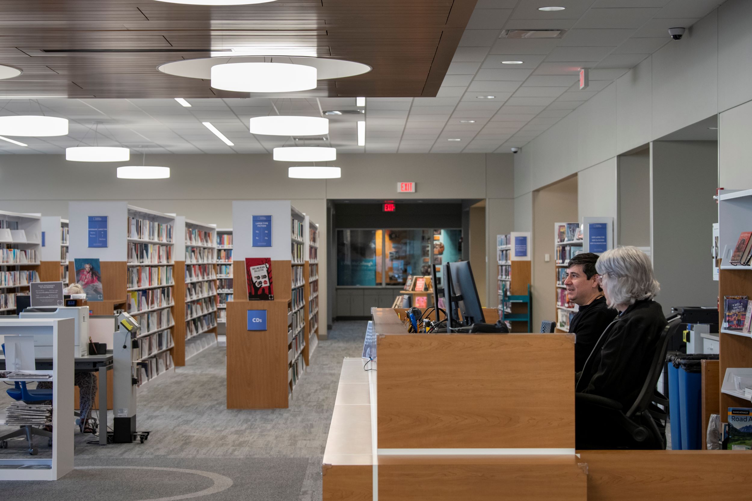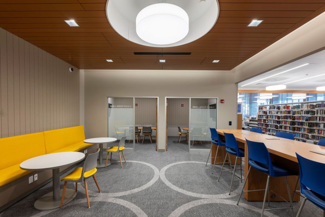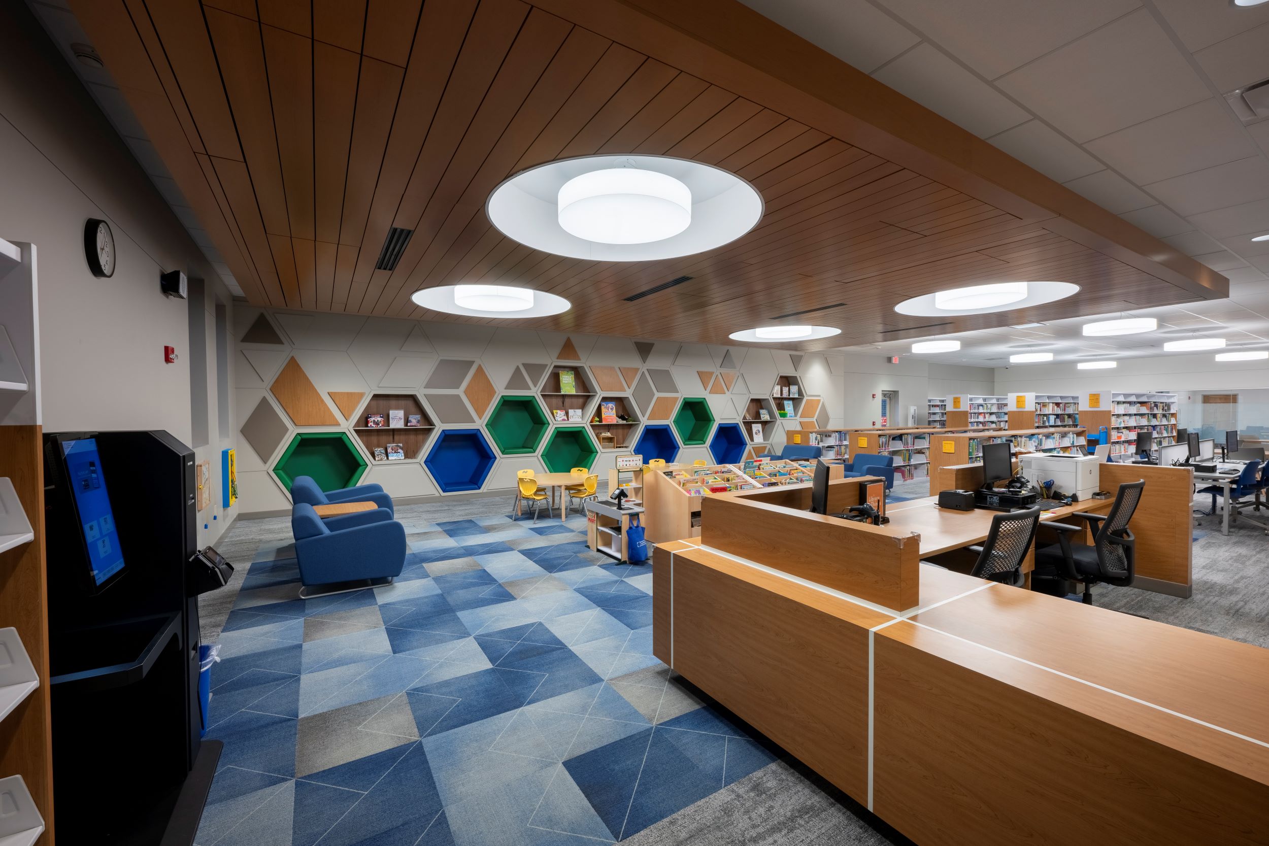 The children’s area was relocated to the front of the building to increase visibility and to allow for an expanded collection. Colorful hexagonal recesses in a new accent wall provide an interactive experience for younger patrons. Relocation of the children’s area allowed for increased staff areas, which include three private offices and an open work room. A large meeting room for programs and activities was incorporated near the east entrance with glass walls to create visibility for encouraged participation and activity.