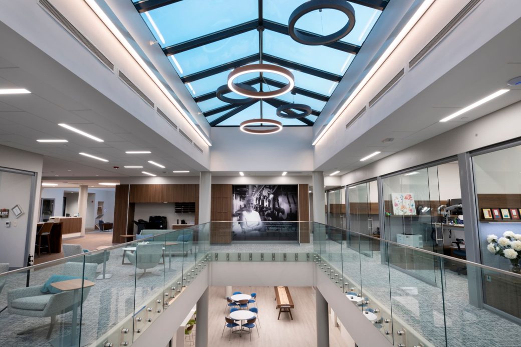 To extend daylight throughout the building, a portion of the floor was removed to expose the glass ceilings and circular pendant lights, which are visible from any public space, including the basement. Artwork is used as wayfinding, featuring a series of installations which tell the story of Fort Wayne’s history and of founders Helene and Esther Foellinger, who perpetuated their family’s tradition of civic involvement and contributions for the well-being of their community.