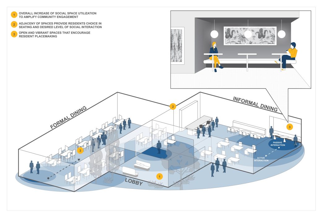 Renovations to the entry lobby, dining areas, and gathering spaces among independent living apartments.