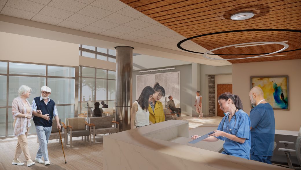 The Lutheran Kosciusko Hospital addition and renovation project provides a new experience for patients, staff, and the broader community. At the heart of the renovation is a bold main entrance, featuring a sweeping glass facade and an expanded lobby that re-centers the hospital’s civic identity and improves visitor orientation by consolidating multiple entry points, creating an accessible and welcoming front door complete with expanded parking, improved signage, and enhanced landscaping. Inside, generous daylight, open seating areas, and regional materials make the lobby both inviting and efficient for arrivals, registration, and wayfinding.
