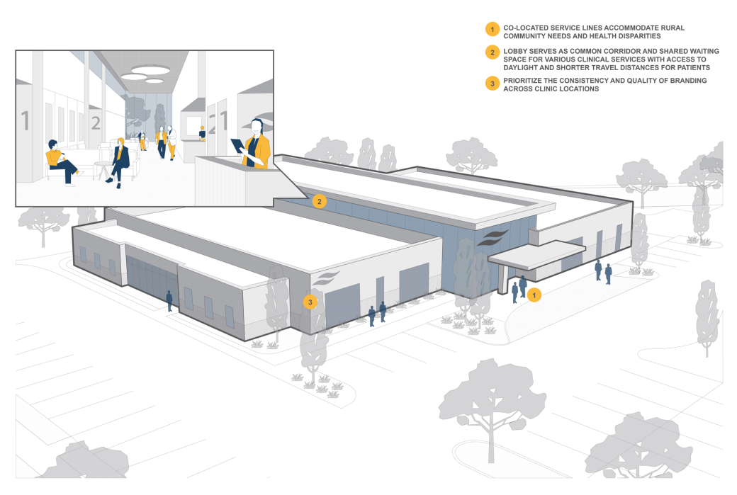 This primary and specialty care access point for Mercer Health Medical Group at Maria Stein provides centralized healthcare for Mercer County and surrounding communities. The clinic offers 13 primary care exam rooms, 3 procedure rooms, a lab, community classroom, and a centralized, daylit waiting space with clear sight lines to the outdoors and surrounding walking trail. Site amenities include vehicle drop-off with a drive-up canopy and ample patient and staff parking. The building provides views and access to a green space owned by the local park, and the campus shares access to an adjacent walking trail. Mercer Health has worked with the local park system to enhance the landscaping in that area.