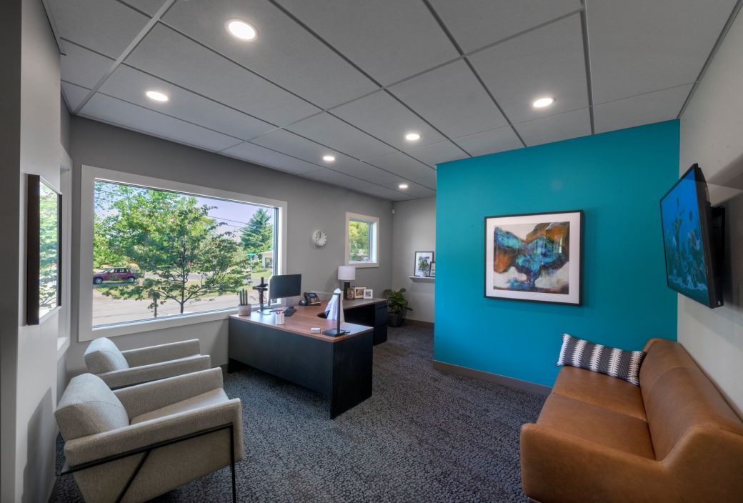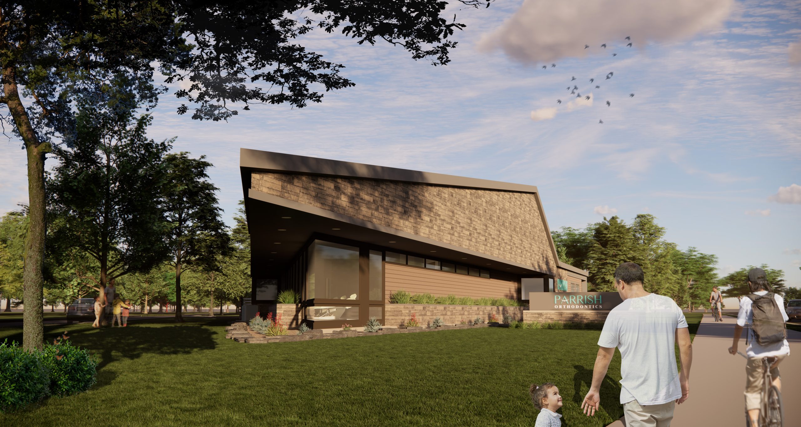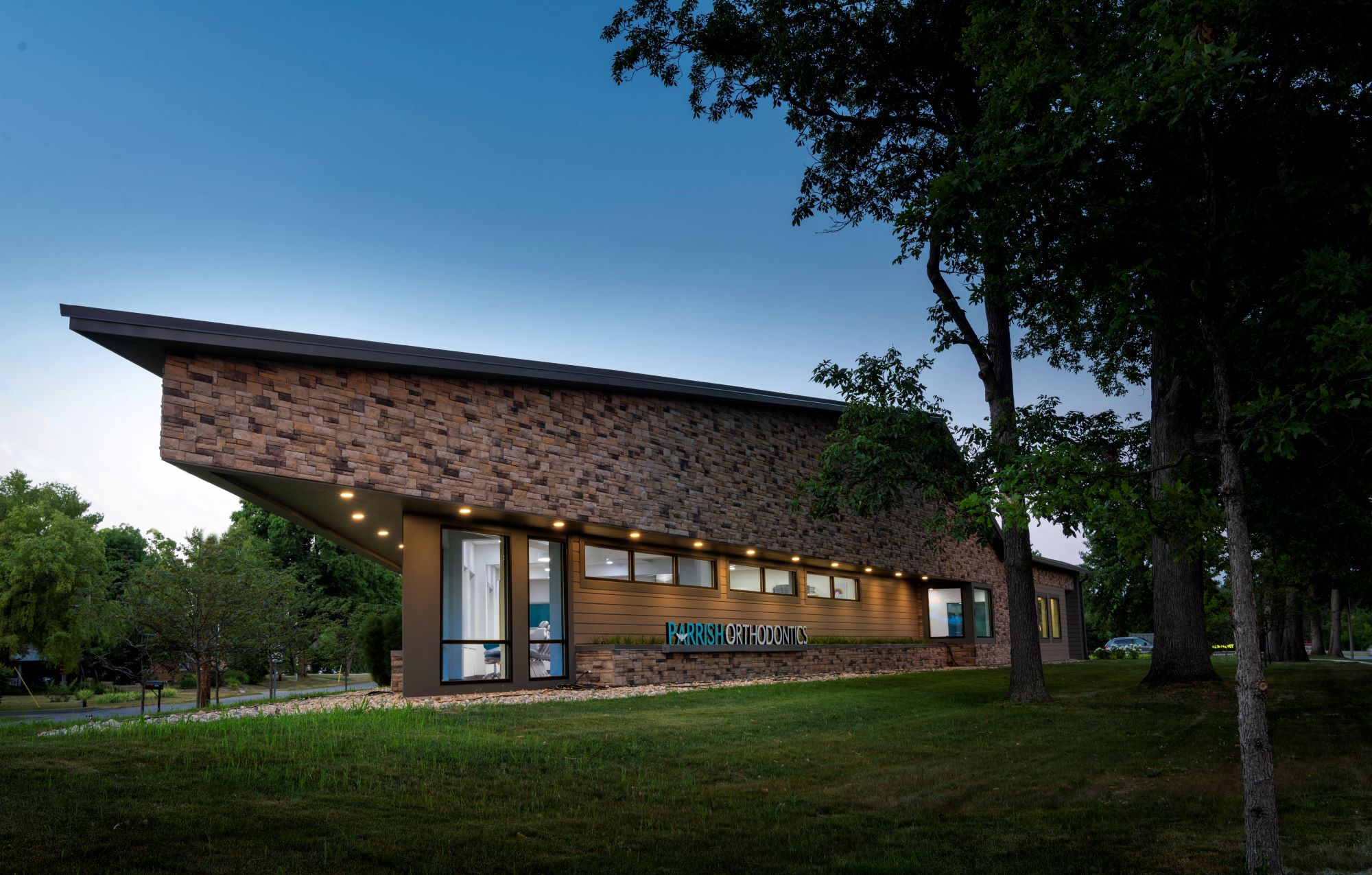 Dr. Parrish’s eye for design and forward-thinking approach allowed the design team to explore different forms and materials to create a new location for a family practice. The site of Parrish Orthodontics, located in a highly visible area of southwest Fort Wayne, posed a unique design challenge due to the triangular shape of the site. MKM took this as an opportunity to envision a geometric, modern building to compliment the plot. Along with its shape, the project is visually distinctive in its use of color and texture. The lower areas of the façade feature fiber cement siding in two shades of gray and taupe. This product’s workability was essential for creating the crisp mitered corners and clean lines, as well as for navigating the trickier points of the triangle. A stone-clad exterior comes to a steep point with a 20-foot overhang above a wall of floor to ceiling windows. The roof is a complex form, with no truss the same.