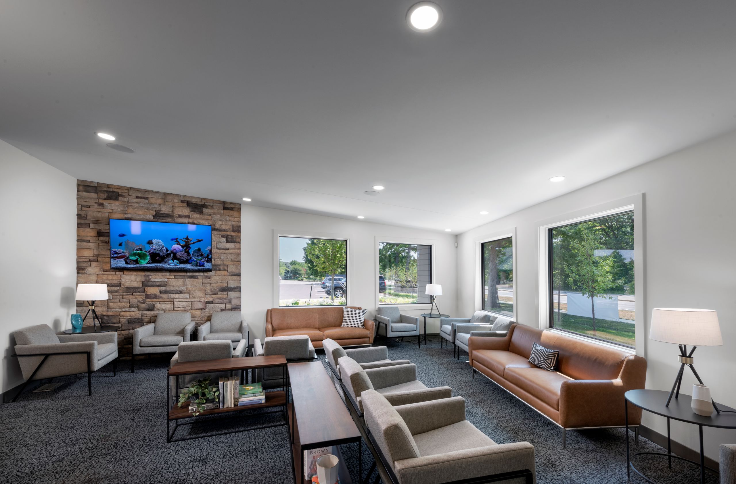 Upon entering the building, a welcoming reception desk boasts a wood feature wall, made from plank flooring. Interior signage was created from the trunk of a tree removed from the site to make way for the new building. An open interior allows visitors to have a feel for the undulating form of the building. Interior spaces are warm and inviting with a mid-century modern aesthetic, complemented by wood and stone finishes.