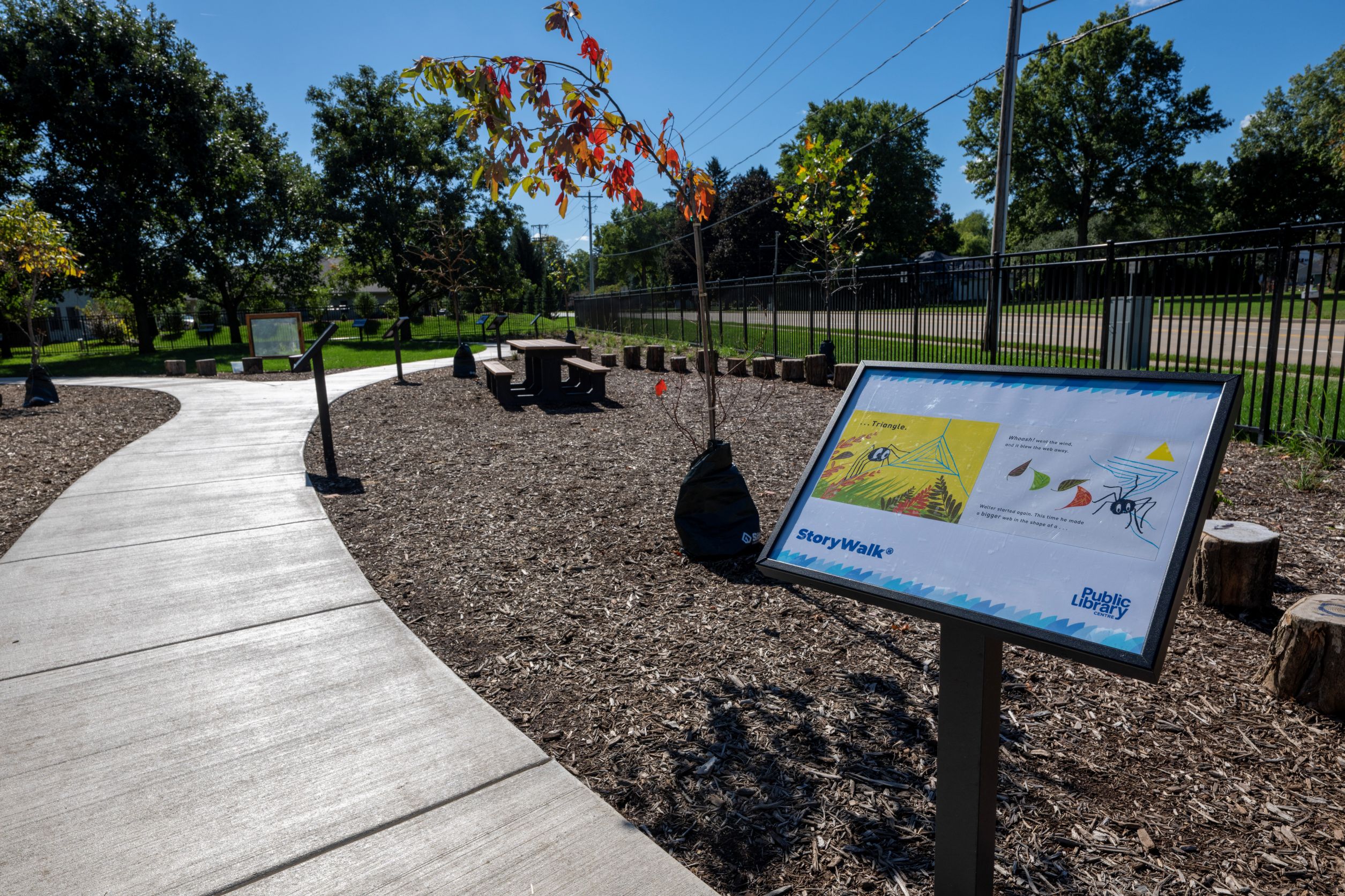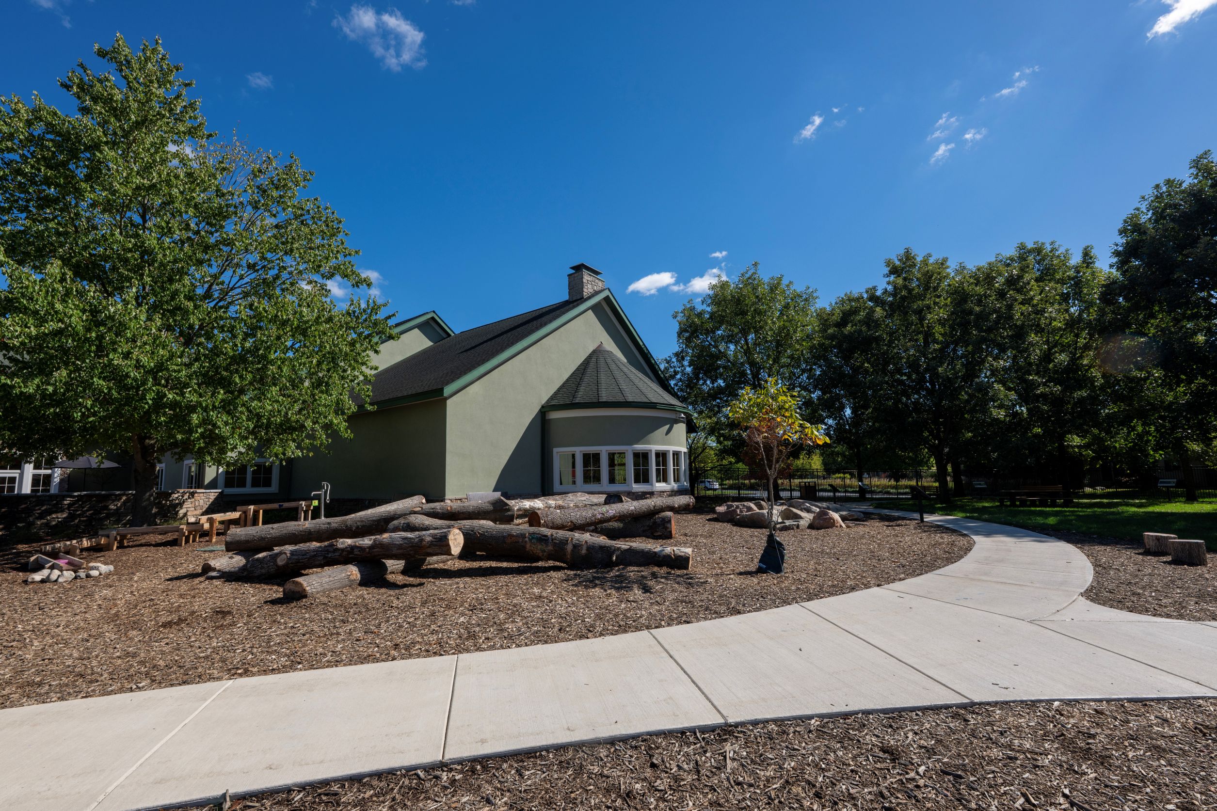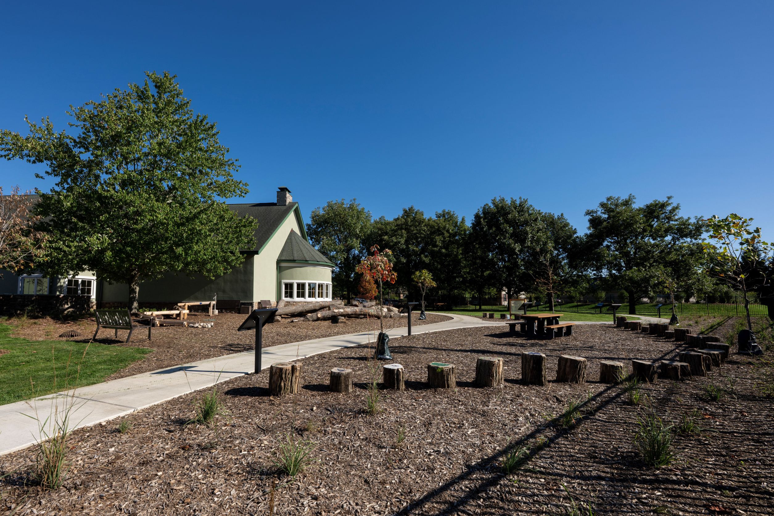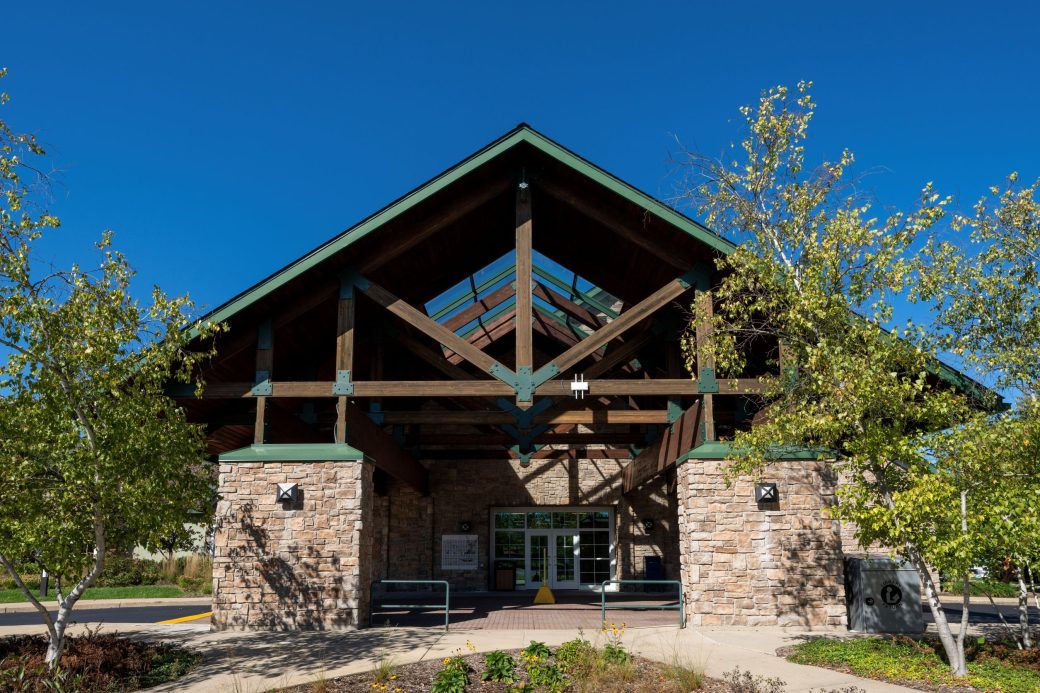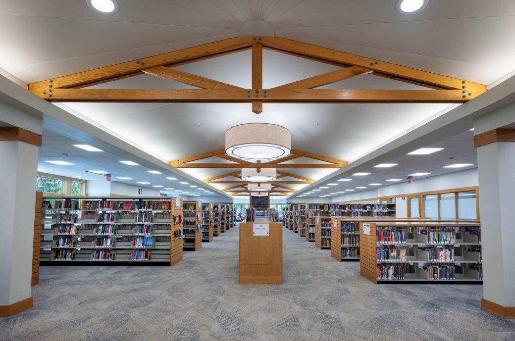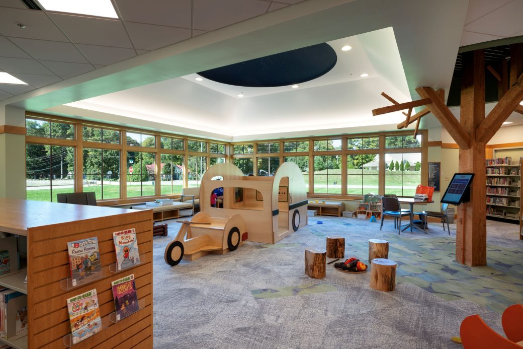 New modern lighting fixtures enhance the central vaulted ceiling, bringing warmth and energy to the middle of the space while exterior renovations include a complete window replacement, façade refinishing, and thoughtful landscaping improvements. The highlight of these updates is the design of a new nature-based outdoor play area featuring climbing logs, a water feature, art panels, and a story walk that extends the library’s mission beyond its walls, connecting learning and play with the natural world, and offering a new way for patrons of all ages to explore, imagine, and grow