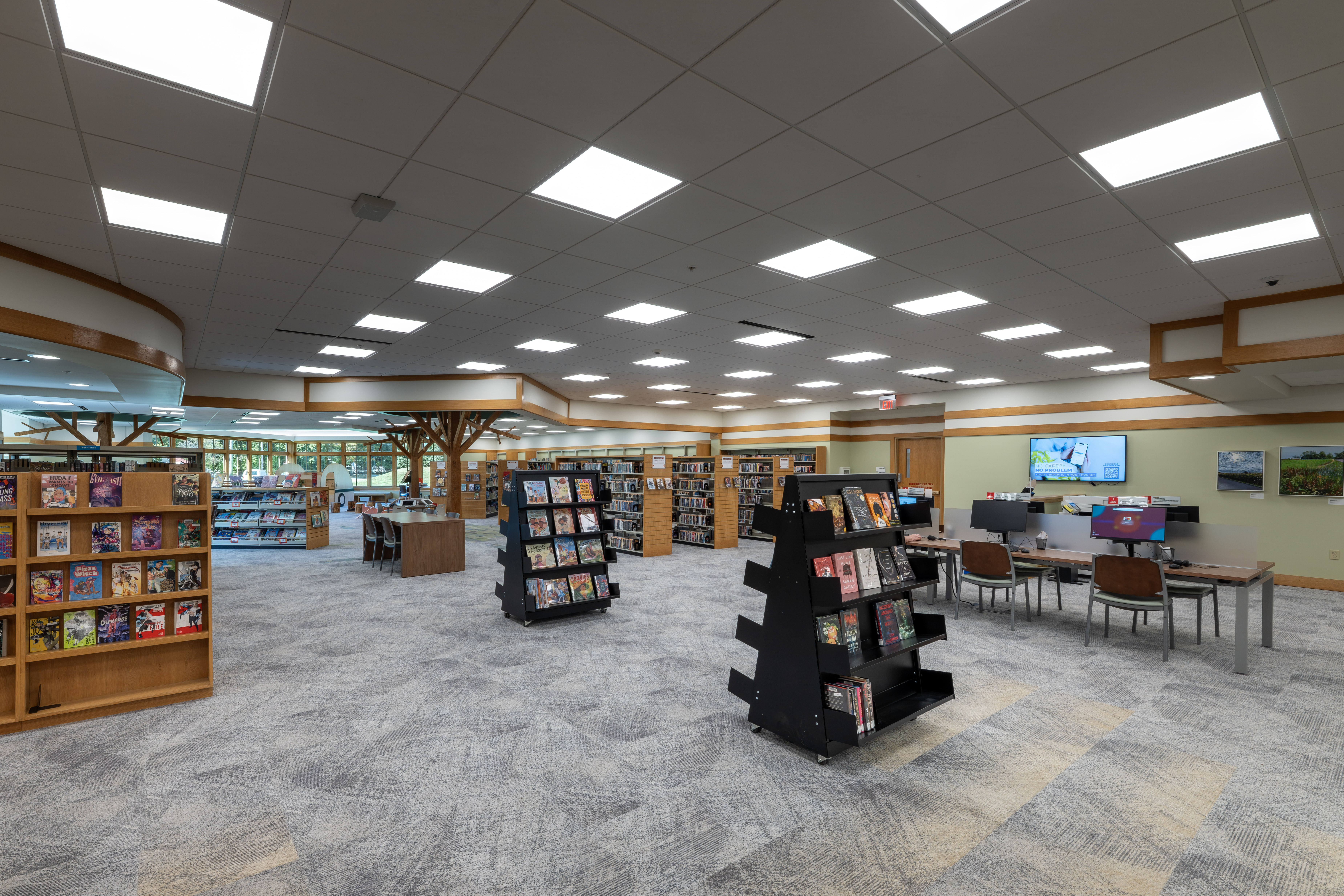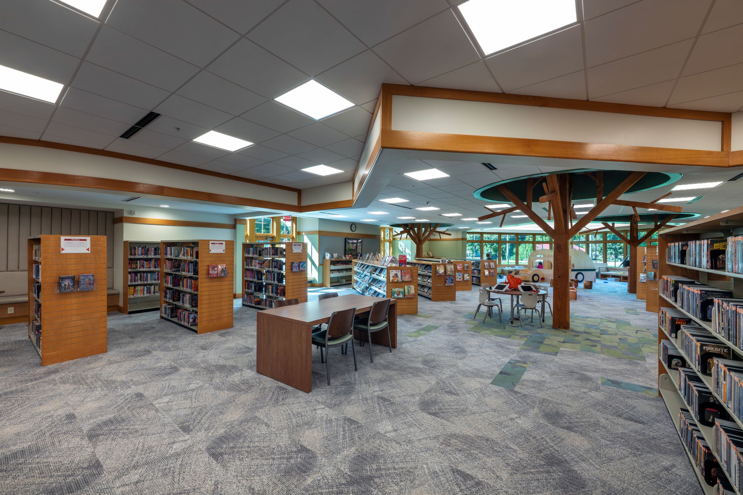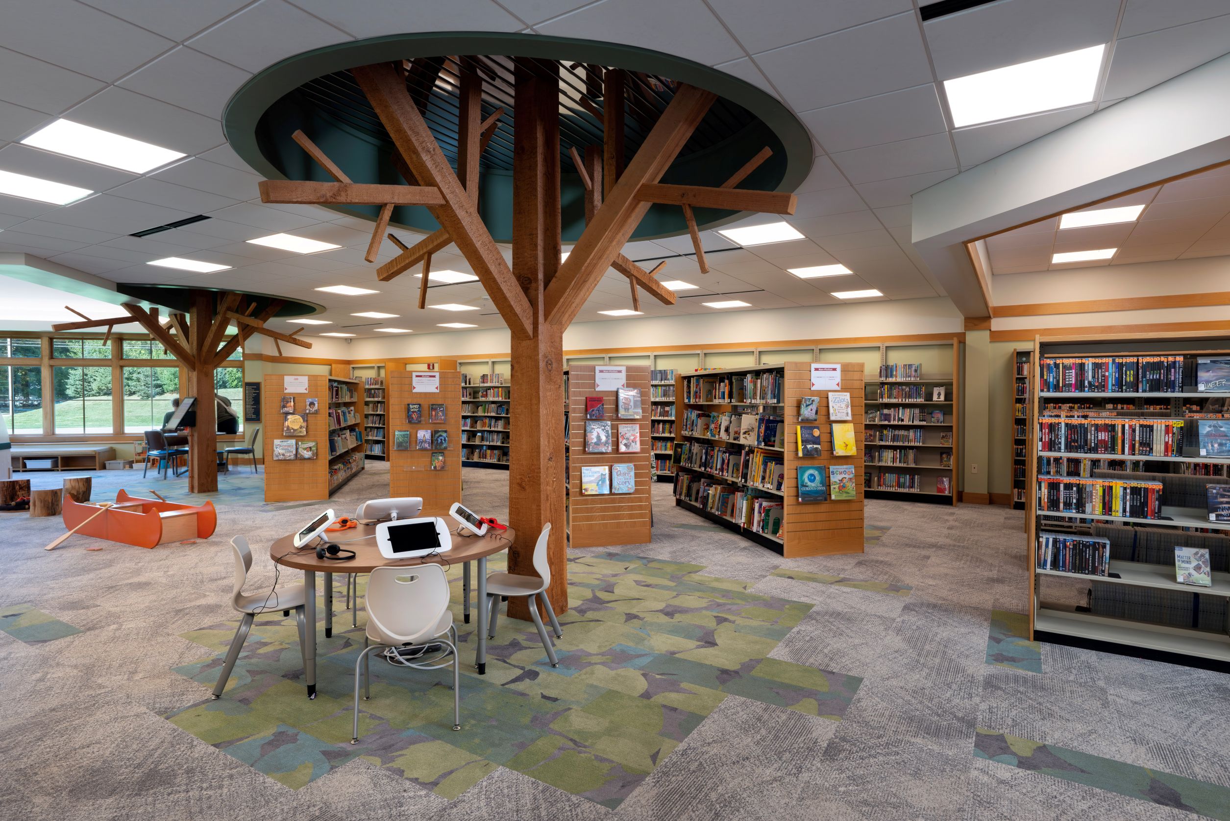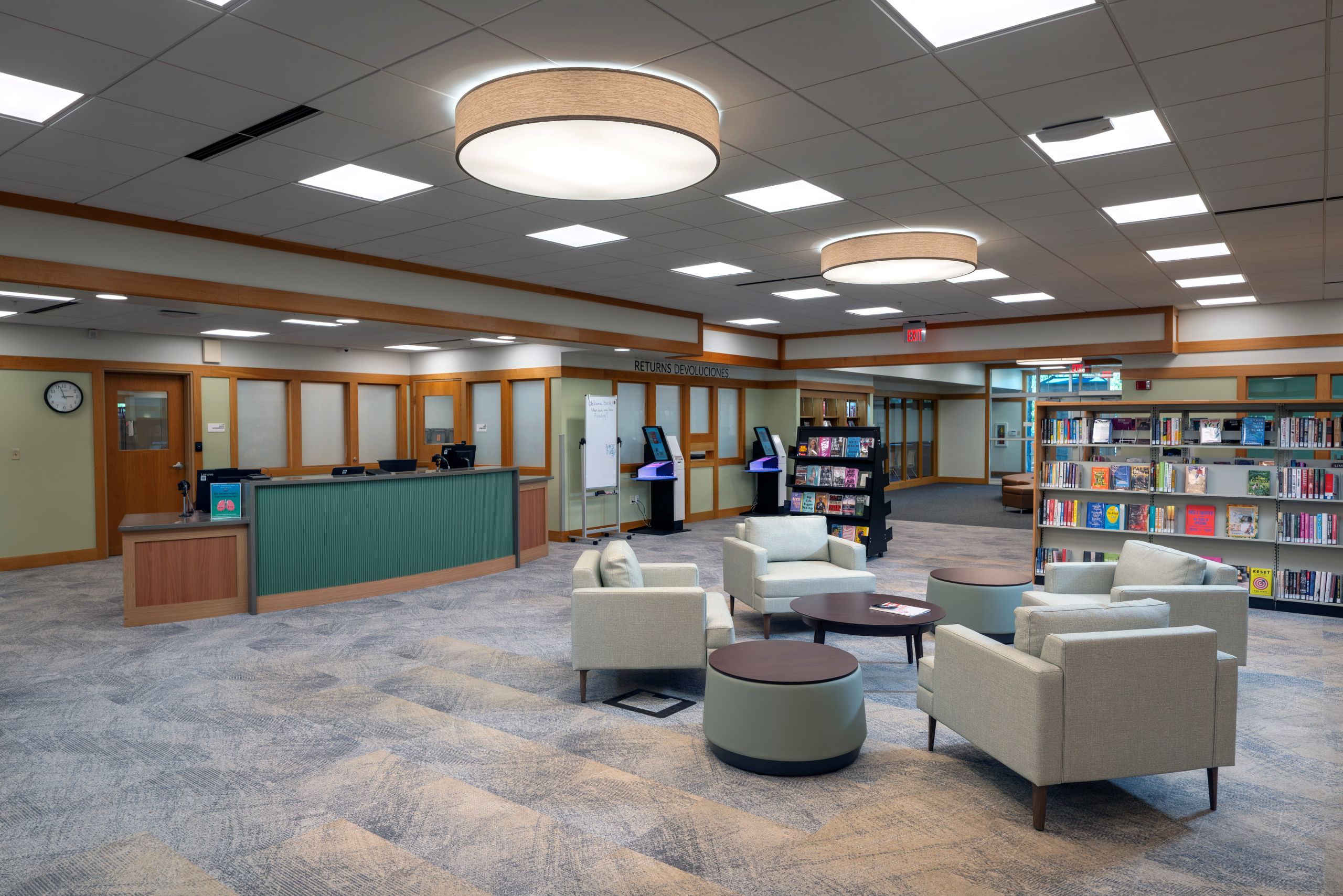 Interior renovations with full replacement of interior finishes including new study rooms, circulation desk, and lighting. Exterior renovations including windows, re-finishing facade, and upgrades to landscaping with new nature-based play area.
