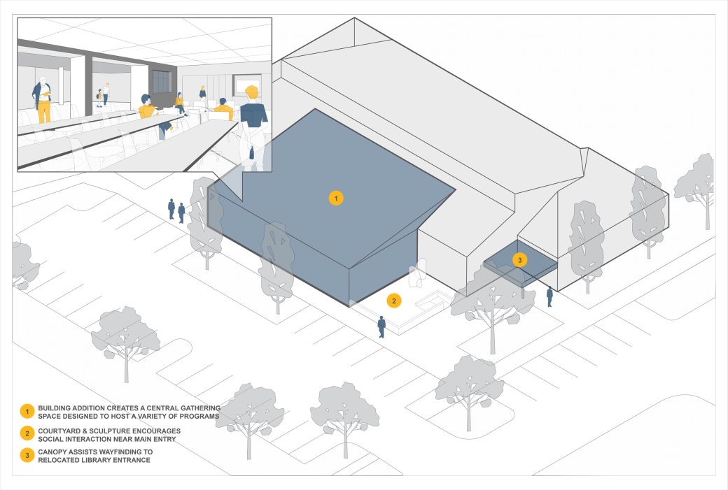 Full renovation of the existing library branch along with a 2,000 SF addition for expanded services, programming, and other site upgrades.