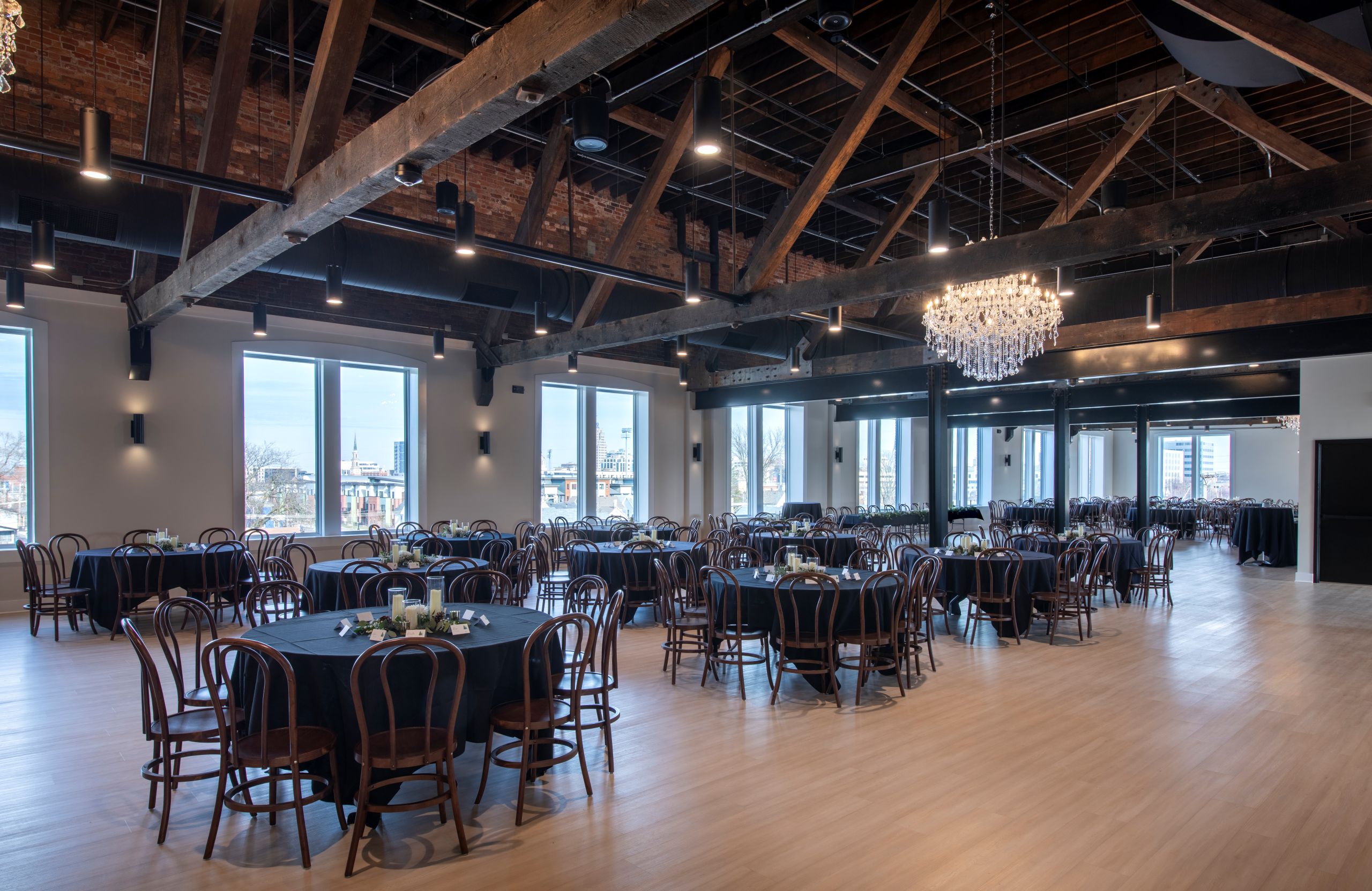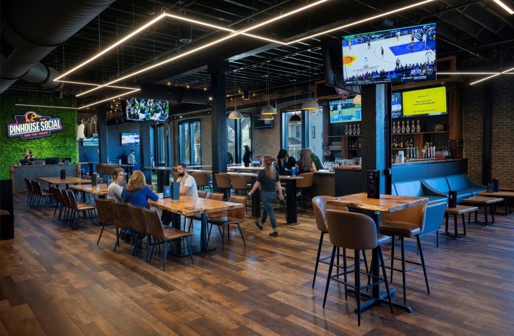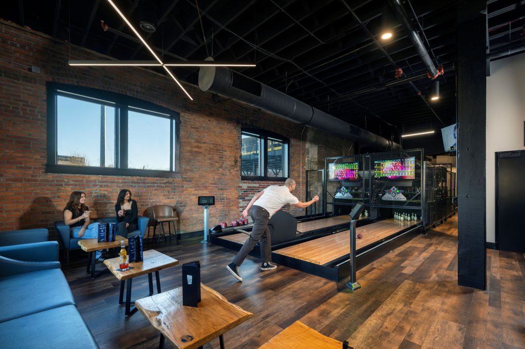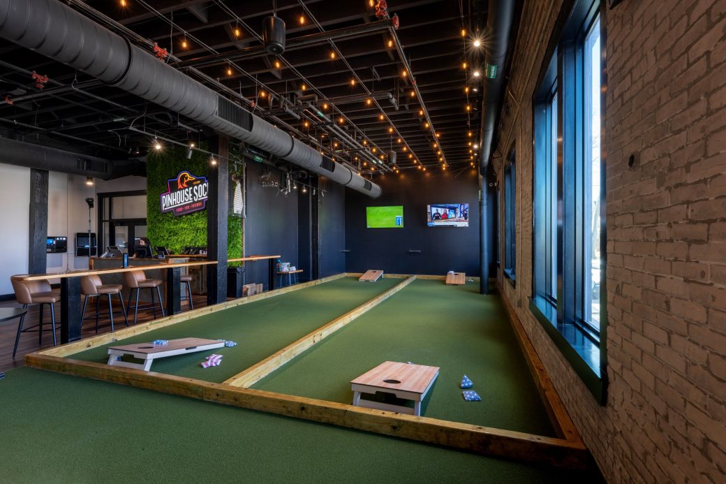 Each floor offers a variety of amenities. The first floor features Pinhouse Social, the city’s first duckpin bowling venue, a full restaurant and bar, and an area for bocce ball. Urban Golf is housed on the second floor, with a full bar, a pro shop with golfing accessories, and eight bays of golf simulators. The third floor features The Fairfield Wedding & Events, with a full catering kitchen, a full bar, and a bridal suite.