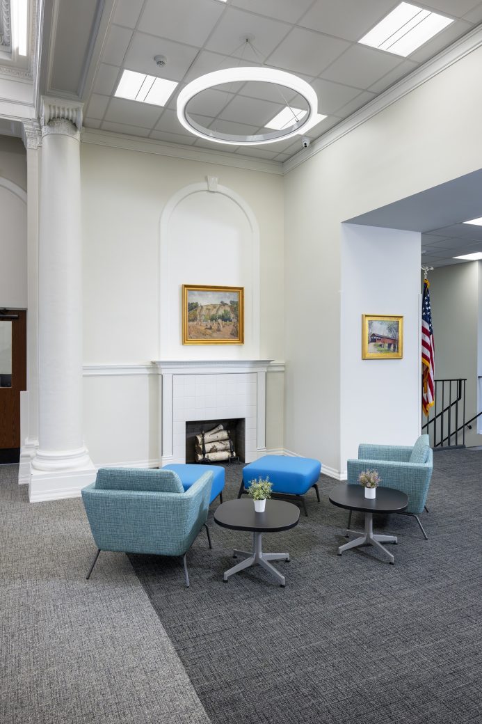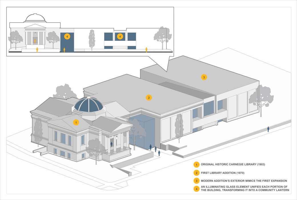 With functions including an enlarged Children’s Department, activity spaces, community meeting rooms, and expanded collection areas, the design for the renovated and expanded facility also wanted to explore the community’s historic connection to light. The design transforms the library into a “lantern” for the downtown, responding to Carnegie’s support of “enlightenment” and existing as a beacon for things to come.