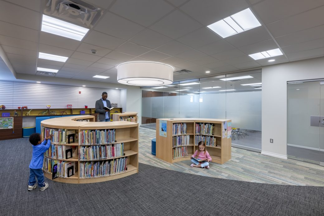The design enlarged the children’s department, activity spaces, community meeting rooms, and expanded collection areas with the intention of embracing light.